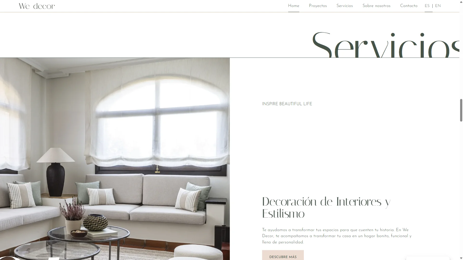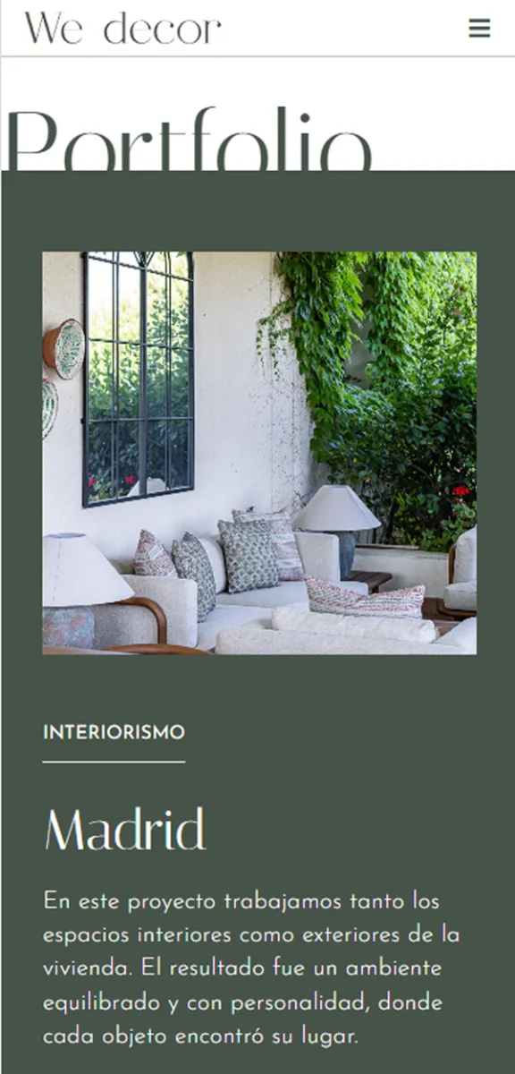 Cada fotografía funciona como protagonista, enmarcada por textos discretos y elegantes. Esta relación entre tipografía y fotografía convierte la web en una extensión visual del estilo interiorista que representa We Decor, una experiencia coherente, estética y emocionalmente atractiva.